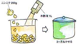 トウガラシ液と同じ。トウガラシ液100cc、ニンニク液100ccを水2Lに混ぜて撒くとさらに強力になる。効果はアブラムシ、スリップス、アオムシによく効く。 ※この液にふれた手で目を触らないこと。
